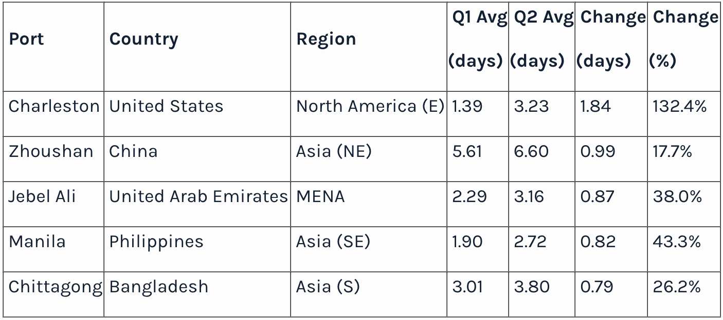 Global Port Congestion: H1 2024 in Review - BeaconNorth American Port Congestion: Struggles in Charleston, Stability on the West CoastOur port congestion index reveals the Port of Charleston experienced a staggering 132.36% increase in congestion, with average combined anchor and berth times jumping from 1.39 days across Q1 to 3.23 days in Q2. While Charleston struggled, other North American ports generally maintained stable congestion levels. Vancouver, despite remaining among the top five most congested ports globally, managed to reduce average congestion times by 1.44 days compared to Q1. Los Angeles also held steady, demonstrating resilience amidst high demand. This trend is encouraging for the persistently congested North American West Coast. Elsewhere in North America, Houston and Oakland reduced congestion times by 1.5 and 1.0 days, respectively. Asian Port Congestion: A Mixed BagIn Southeast Asia, 64% of analysed ports saw rising congestion. Manila reported the most significant increase, adding nearly 20 hours to average anchor and berth times. Chittagong (Bangladesh), Port Kelang (Malaysia) and Singapore also reported large increases in congestion levels. Conversely, East Asia has shown remarkable resilience. Only four of 26 analyzed ports reported increased average congestion in Q2. Ningbo-Zhoushan, however, saw congestion rise by 17.7% despite a strong month-on-month improvement in June. Ports Reporting the Largest Congestion Increases (Q2 vs. Q1) Port