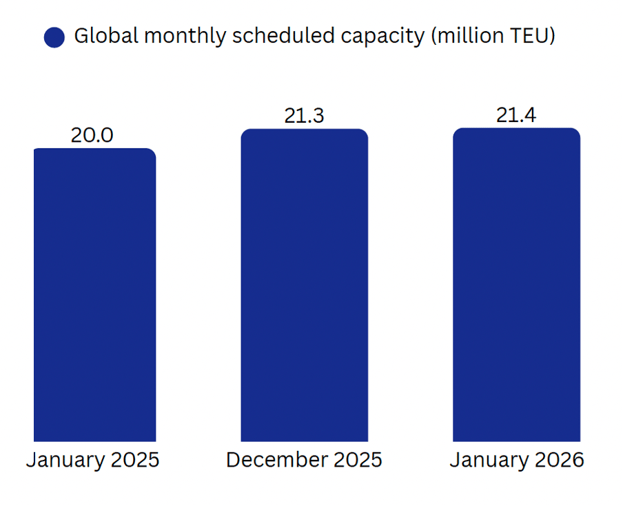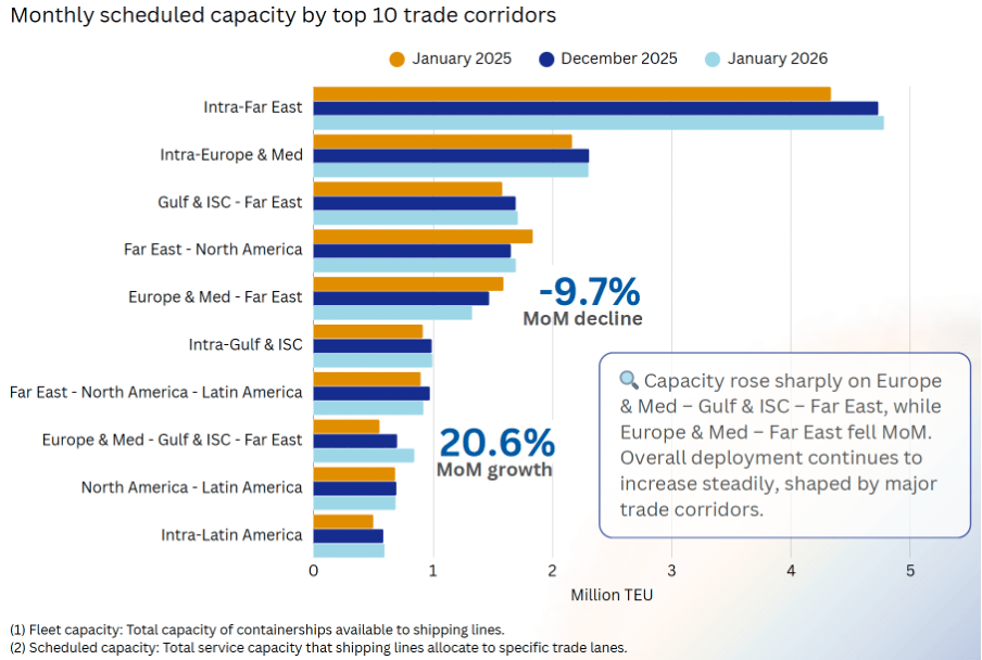 Market News: Signal Ocean Announces Strategic Acquisition of AXSMarineSignal Ocean announces the strategic acquisition of AXSMarine, a recognized leader in the maritime freight and commodities tracking space. The move reflects Signal's commitment to advancing technology, innovation, and collaboration across the global shipping ecosystem. The combined product portfolio extends beyond the primary offerings to also include AXSMarine affiliate Next Voyage Maritime Pte. and Signal Ocean affiliate Shiplex S.A., who develop voyage and ship management ERP solutions. Together, the group now supports a community of more than 1,500 clients. Global Containership Insights: January 2026 - MDS TransmodalGlobal scheduled container capacity reached 21.37 million TEU in January 2026, up 0.3% month-on-month and 7.0% year-on-year. Growth was driven by the intra-Far East trade corridor, which accounted for 22.4% of total capacity, supported by vessel deliveries and redeployments. Although Suez transits have remained largely limited to ad-hoc sailings, the Ocean Alliance has signalled a shift by reinstating two Far East–North Europe/Mediterranean services via the Canal from January 2026. Snapshot: