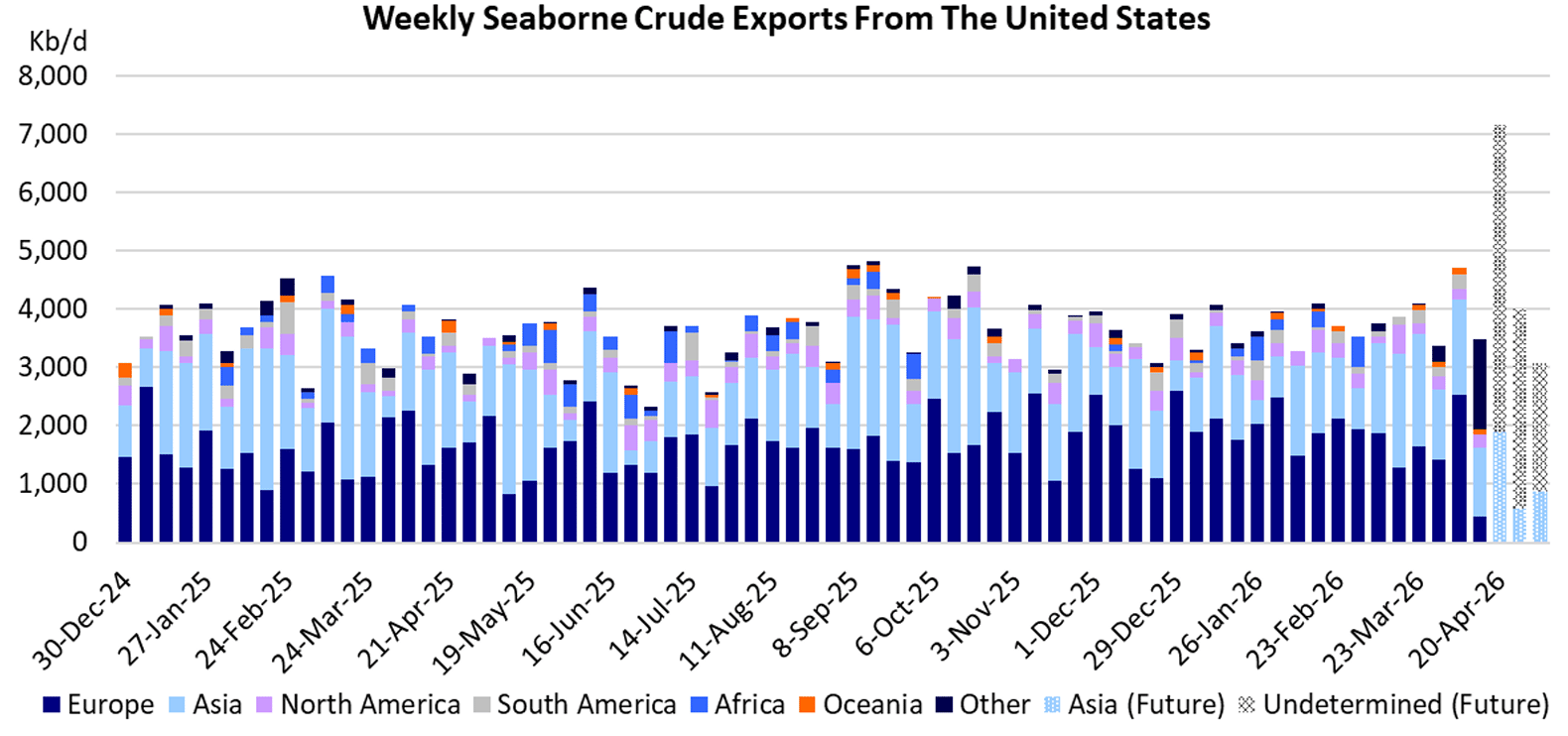 'Energy Dominance' In Action - VizionThe crisis in the Middle East and in particular the effective closure of the Strait of Hormuz has upended global oil markets. Both crude oil and refined products are now in short supply. Refiners around the world are desperate to get their hands on alternative sources of crude oil, almost at any price. However, the options are limited and dwindling. The volume of Russian and Iranian oil in floating storage is shrinking fast since the U.S. has lifted some of its restrictions, allowing countries to buy these previously sanctioned barrels. Several countries have tapped into their strategic petroleum reserves, but most of this oil is being allocated to domestic refiners and not traded internationally. So, the focus has shifted to the Atlantic Basin, where several producers (Venezuela, Canada, Brazil) have some capability to ramp up production and exports. However, in this Weekly Tanker Opinion we want to highlight the United States. The United States is by far the largest oil producer in the world. In 2018 it surpassed Russia and Saudi Arabia due to advancements in hydraulic fracturing (fracking) and horizontal drilling. U.S. crude oil exports, which (re)started in earnest after the crude export ban was lifted about 10 years ago, quickly ramped up from 500 K in early 2016 to average more than 4.0 Mb/d in 2023 and 2024. According to data released by the U.S. Energy Information Administration (EIA) on Wednesday, exports climbed to 5.2 million bpd, the highest in seven months. This was due to record demand from Asian and European buyers, who are scrambling to replace barrels from the Middle East that are trapped inside the Persian Gulf because of the war. U.S. crude oil exporters are expanding their reach. Greece has bought U.S. crude for the first time ever, while Turkey bought a cargo for the first time in a year. The one limitation that could cap the U.S. export potential is the specifications of the U.S. crude. West Texas Intermediate (WTI), the main U.S. export, is a light sweet crude, while the refiners are trying to replace medium sour barrels from the Middle East. MARS crude is a medium sour grade produced in the U.S. Gulf of Mexico, but its production volumes are limited. At the same time as exports surged, U.S. crude imports took a dive. Imports from Canada were at their lowest level for this year. Flows from Saudi Arabia and Iraq were down significantly as well, for obvious reasons. As a result, net imports of crude oil (the difference between imports and exports), narrowed to 66,000 barrels per day last week, the lowest on record in weekly data that goes back to 2001. This means that the U.S. nearly turned into a net crude exporter last week for the first time since World War II. Exports are expected to increase significantly in the coming weeks (see Chart 1) and this switch to a net exporter could become reality.